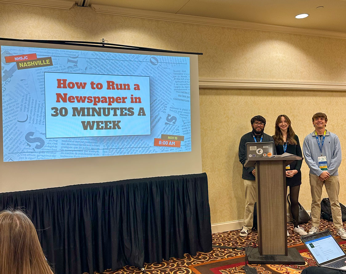 Twenty-seven Shorecrest students used the opportunity to receive important training from experts in the field, which included — this year — their own editors. Editors-in-chief Braden Stone ’26, Bijoy Alam ’26, and Sally Keane ’26 were honored by being selected to present their session, How to Run an Award-winning Newspaper in 30 Minutes or Less Per Week.